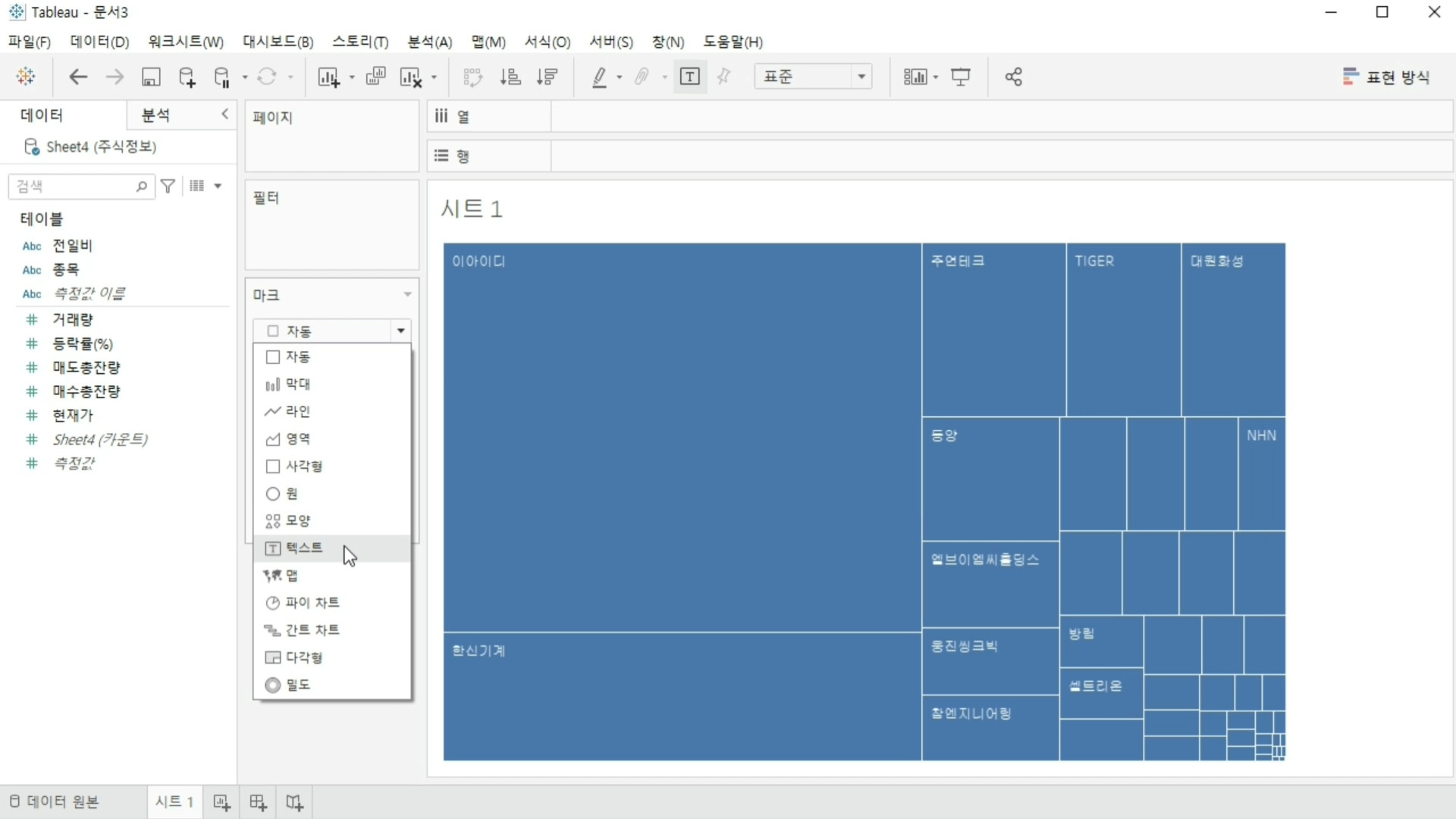 워드클라우드 처럼 크기가 다르게 하기 위해서 거래량 부분을 크기에 가져가 보세요.