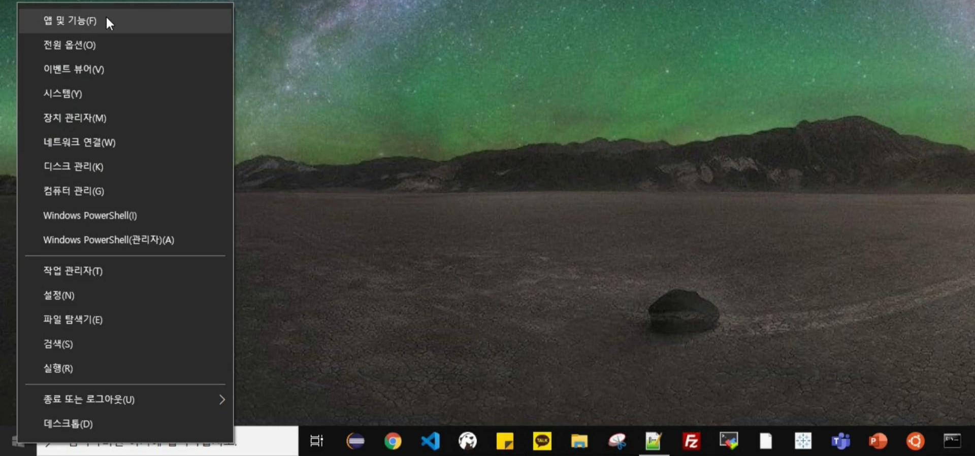 이제 하이퍼V를 구성하기 위해서 윈도우 아이콘에서 마우스 오른 클릭하여 앱 및 기능으로 들어갑니다