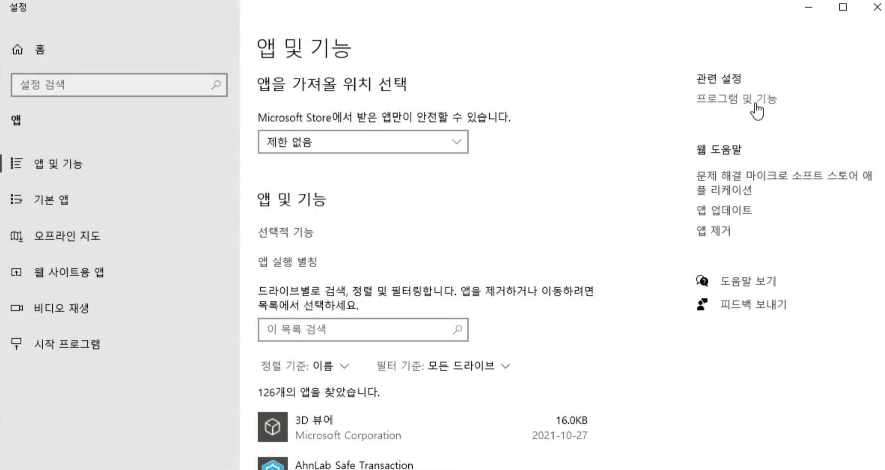 프로그램 및 기능을 누르고