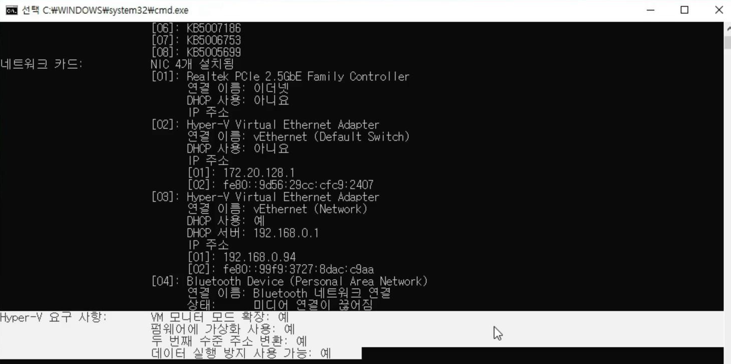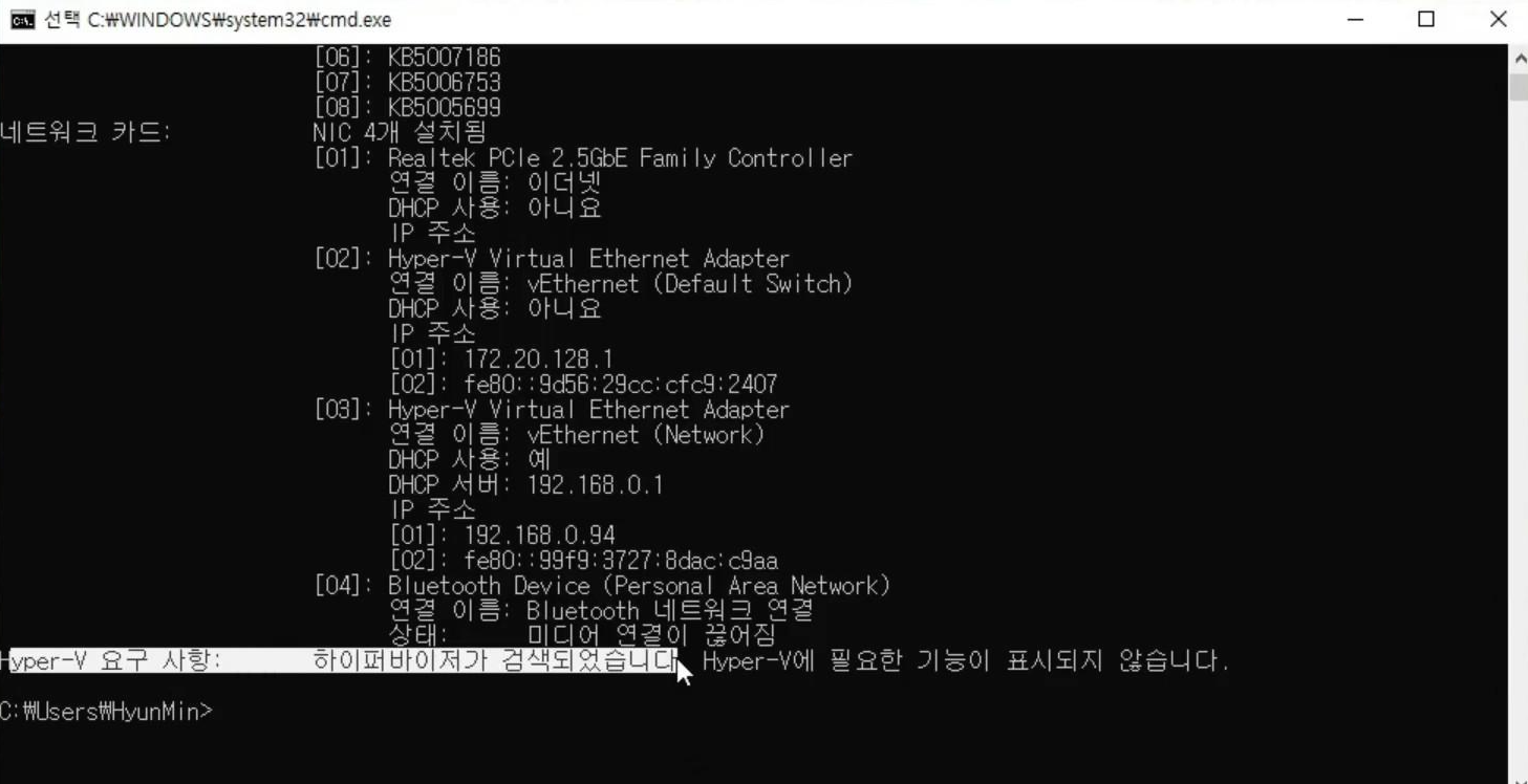 재시작 하고 나서 cmd에서 같은 명령어를 입력해보면 Hyper-V 요구 사항 부분이 나오면 잘 구성된 것입니다.