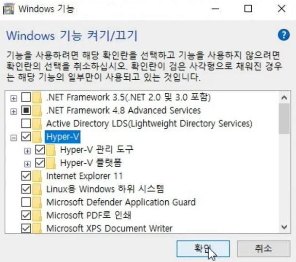 Windows 기능 켜기/끄기 화면이 나오면 Hyper-V라는 부분을 찾아서 체크해주고 확인을 누르세요