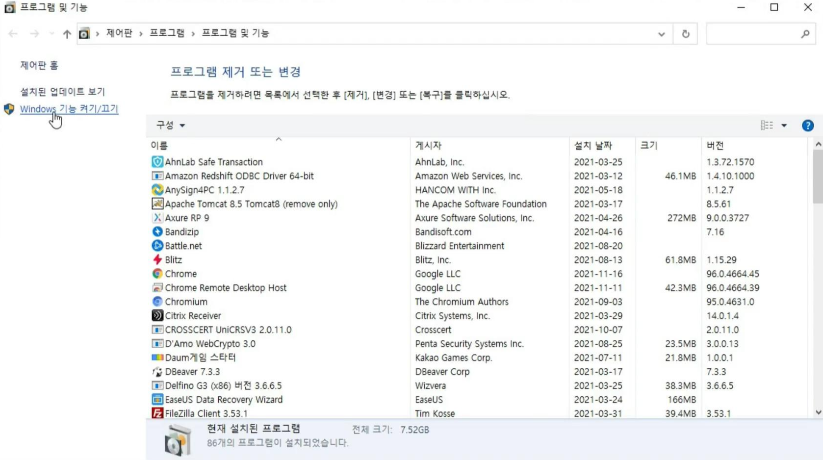 Windows 기능 켜기/끄기로 들어가세요
